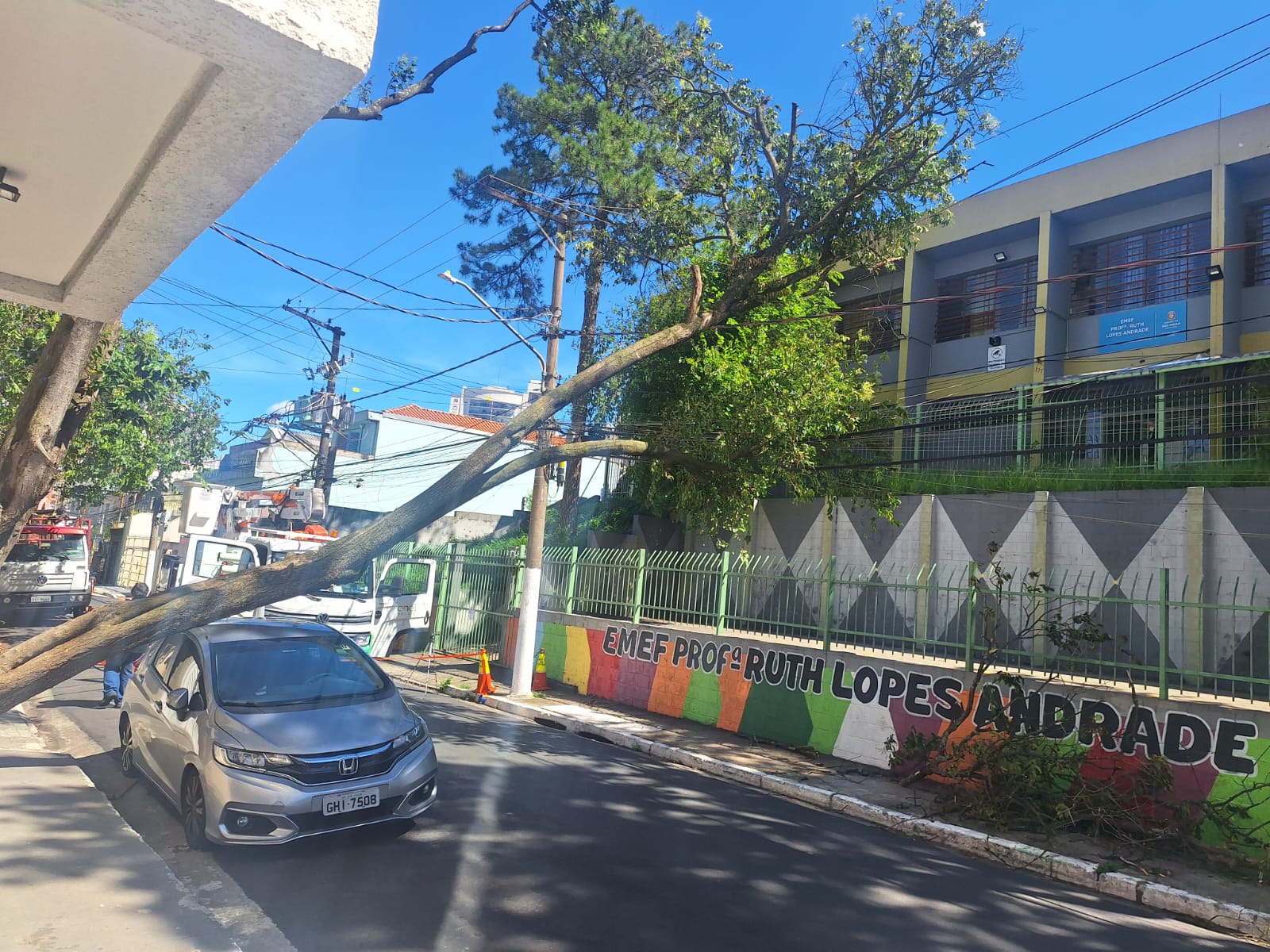 Na rua Jundiapeba, na Vila Zelina, outra grande espécie ficou atravessada na rua e sobre a escola municipal de educação fundamental (EMEF) Profª Ruth Lopes Andrade. O fornecimento de energia na via foi interrompido por volta das 11h da quarta e somente na manhã do dia seguinte uma equipe da Enel foi ao local, restabelecendo o serviço mais de 24 horas depois.