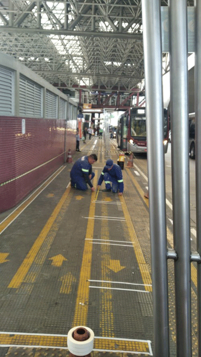 Desde ontem, alguns terminais de ônibus passaram a ter marcações no chão para delimitar o espaço entre as pessoas nas filas e evitar aglomerações (foto abaixo). Mais terminais ganharão a pintura neste final de semana.