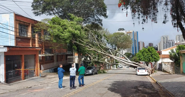 O Corpo de Bombeiros recebeu mais de 100 chamados de quedas de árvores na cidade até às 19h de ontem, dia 11. Pelo menos duas grandes espécies desabaram sobre veículos na região, atingiram residências e provocaram a interrupção do fornecimento de energia elétrica. Um dos casos ocorreu na rua Inhangapi, próximo ao cruzamento da rua Manaias, na Vila Zelina.