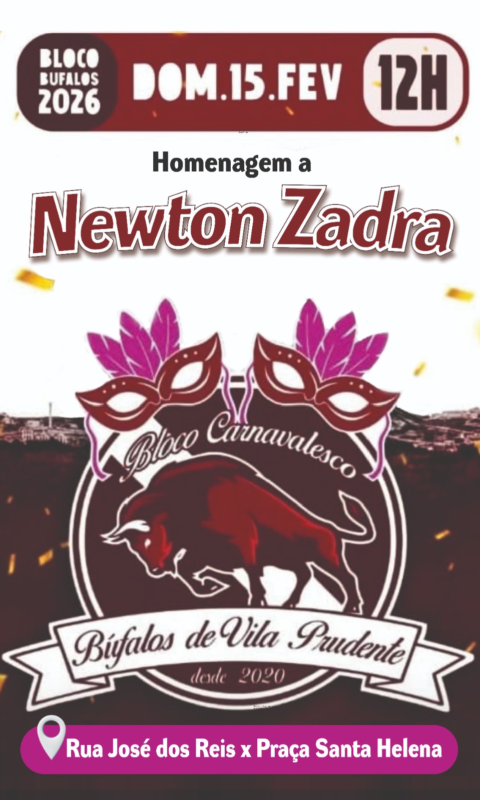 O Bloco Búfalos de Vila Prudente já virou tradição no carnaval de rua da região. O desfile está marcado para o próximo domingo, dia 15, com concentração a partir das 12h na rua José dos Reis, altura da praça Santa Helena. As apresentações musicais acontecem das 13h às 17h.