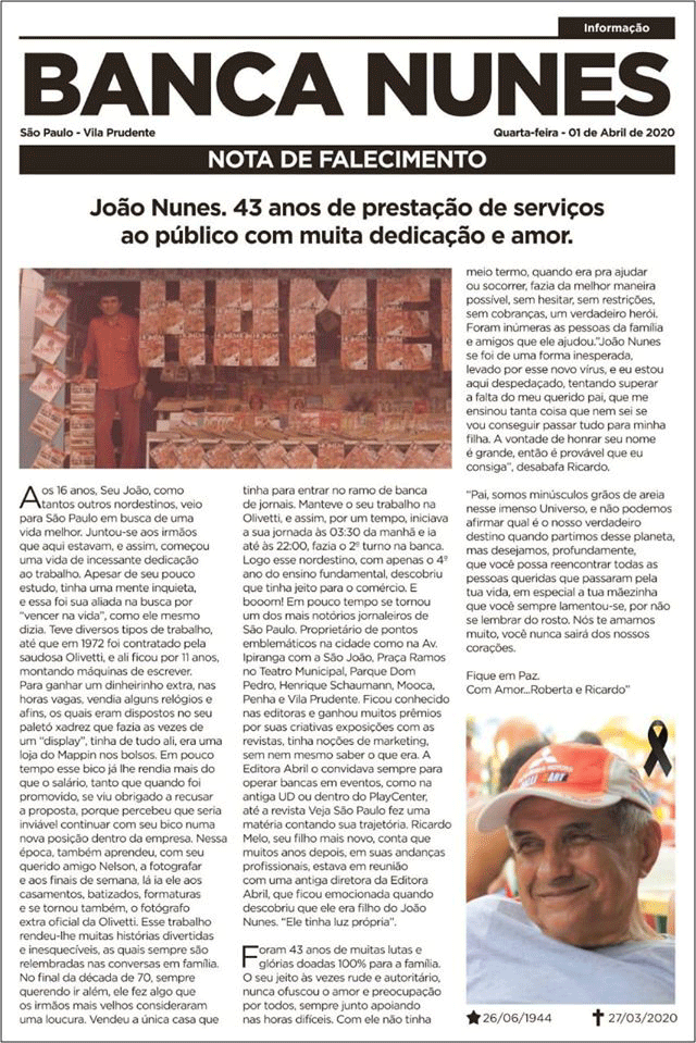 João Nunes deixa a esposa Maria Evandi, a Vanda; os irmãos Anatalício e Maria Anita; os filhos Ricardo e Roberta e os netos Gabriel e Laura, além de uma legião de amigos conquistados nos mais de 43 anos como bem sucedido jornaleiro.