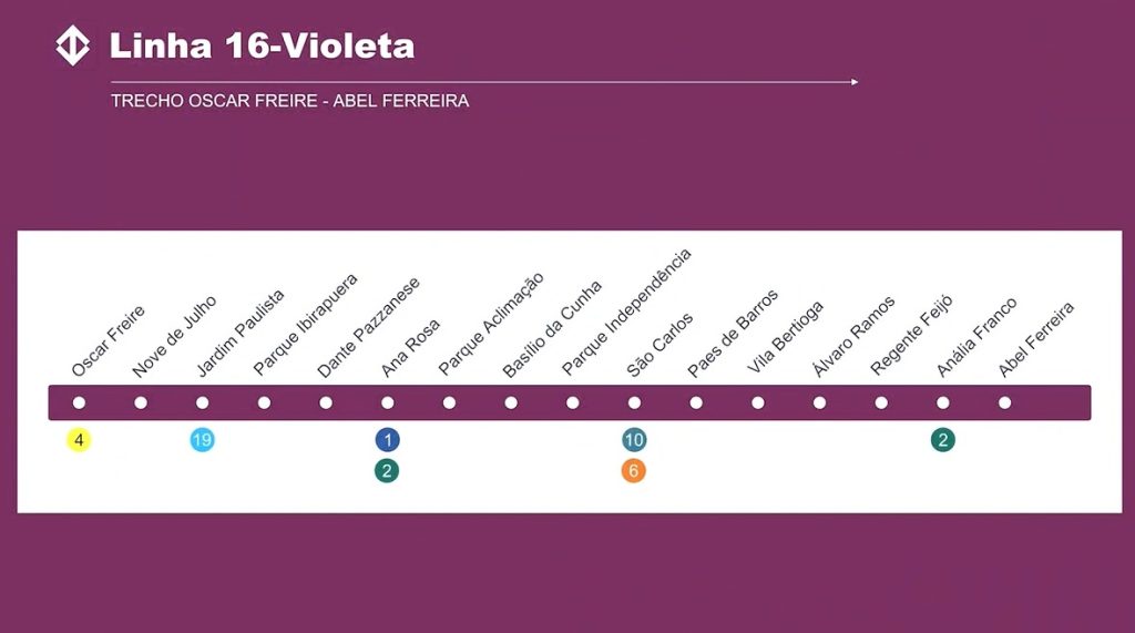 A futura Linha 16 contará com oito integrações: Linha 1-Azul na estação Ana Rosa; Linha 2-Verde nas estações Ana Rosa e Anália Franco; Linha 4-Amarela na estação Oscar Freire; Linha 10-Turquesa na estação São Carlos; Linha 14 Ônix na estação Santa Marcelina; Linha 15-Prata em Cidade Tiradentes; e com a futura Linha 19-Celeste, na estação Jardim Paulista.