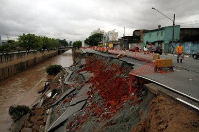 Mais uma vez o asfalto da avenida do Estado não aguentou a força das águas na época de chuvas. No último final de semana, no sentido Centro, próximo à rua Baia Grande, na Vila Bela, uma das pistas da via começou a rachar e a afundar. Apesar do perigo, apenas na terça-feira, dia 15, após denúncia da Folha, a Prefeitura foi até o local e isolou o trecho, para evitar que algum motorista fosse “engolido” pelo asfalto. E o pior aconteceu na noite da quarta-feira, dia 16. Com a chuva que caiu sobre a região, a pista afetada foi aos poucos cedendo e desmoronou sobre o rio Tamanduateí.