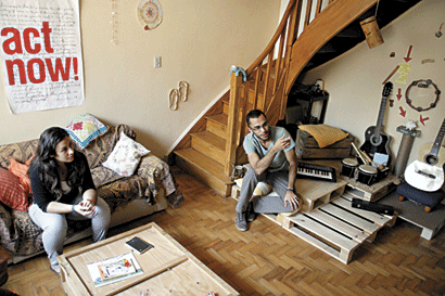 Todos os cômodos da residência, onde vivem quatro jovens com os mesmos ideais, são decorados e equipados com materiais reaproveitados, que em sua grande maioria foram descartados no lixo ou doados. Na sala, os sofás foram frutos de doação, a mesa central é feita com caixotes de madeira e as almofadas são plásticos forrados. No quarto, o armário foi erguido com cabos de vassoura e madeiras que já serviram até para rampa de skate. As cortinas também foram confeccionadas artesanalmente. A cozinha possui uma geladeira com baixo consumo de energia, a mesa também foi adaptada e recipientes de papinhas de nenê se transformaram em potes de armazenamento de temperos. “Tudo que achamos, trabalhamos a criatividade e é reutilizado. Tentamos reduzir resíduos ao máximo”, comenta a arquiteta e urbanista Marcela Fenyves Ary, 25 anos, uma das integrantes do projeto.